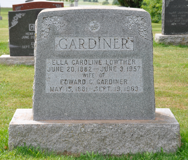 Inscription: GARDINER / Ella Caroline Lowther / June 20, 1882 - June 3, 1957 / Wife of / Edward C. Gardiner / May 15, 1881 - Sept. 19, 1963.2  Tombstone, Edward C. Gardiner (1881-1963), his wife Ella Caroline Lowther (1882-1957). United Baptist Cemetery, Central Bedeque, Prince County, Prince Edward Island, Canada.