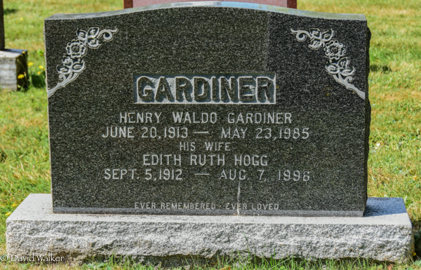 Inscription: GARDINER / Henry Waldo Gardiner / June 20, 1913 - May 23, 1985 / His Wife / Edith Ruth Hogg / Sept. 5, 1912 - Aug. 7, 1996.3,5  Tombstone, Henry Waldo Gardiner (1913-1985), his wife Edith Ruth Hogg (1912-1996). United-Baptist Cemetery, Central Bedeque, Prince County, Prince Edward Island, Canada.