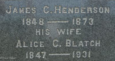 Inscription: Mabel L. / Beloved Wife of / James F. Henderson / 1884 - 1915 / James F. Henderson / 1873 - 1958 / Also His Wife / Cottrell D. Lea / 1881 - 1985 / At Rest / HENDERSONBack: James C. Henderson / 1848 - 1873 / His Wife / Alice C. Blatch / 1847 - 1931.2,3  Tombstone, James F. Henderson (1873-1958), his wives Mabel L. (1884-1915) and Cottrell D. Lea (1881-1985), his parents James C. Henderson (1848-1873) and Alice C. Blatch (1847-1931). Presbyterian/United Cemetery, North Bedeque, Prince County, Prince Edward Island, Canada.  Back inscription detail.