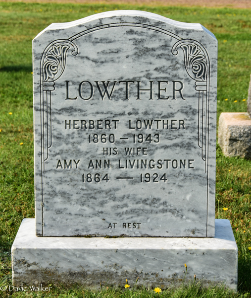 Inscription: LOWTHER / Herbert Lowther / 1860 - 1943 / His Wife / Amy Ann Livingstone / 1864 - 1924 / At Rest.1  Tombstone, Herbert Lowther (1860-1943), his wife Amy Ann Livingstone (1864-1924). Peoples Cemetery, Crapaud, Queens County, Prince Edward Island, Canada.