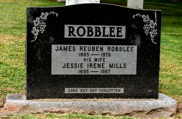 Inscription: ROBBLEE / James Reuben Robblee / 1885 - 1976 / His Wife / Jessie Irene Mills / 1895 - 1967 / Gone But Not Forgotten.1,3  Tombstone, James Reuben Robblee (1885-1976), his wife Jessie Irene Mills (1895-1967). St. John's Anglican Cemetery, St. Eleanors, Prince County, Prince Edward Island, Canada.