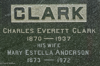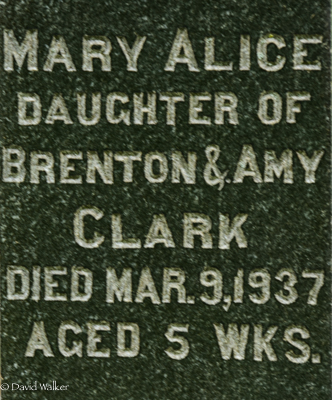 Inscription: CLARK / John William Clark / 1839 - 1925 / His Wife / Barbara Catherine Clark / 1841 - 1931Left: Mary Alice / Daughter of / Brenton & Amy / Clark / Died Mar. 9, 1937 / Aged 5 wks.Back: CLARK / Charles Everett Clark / 1870 - 1937 / His Wife / Mary Estella Ancerson / 1873 - 1972.1  Tombstone, John William Clark (1839-1925), his wife Barbara Catherine Clark (1841-1931), their great granddaughter Mary Alice Clark (1937-1937), their son Charles Everett Clark (1870-1937), his wife Mary Estella Anderson (1873-1972). Peoples Cemetery, Summerside, Prince County, Prince Edward Island, Canada.  Left inscription detail.  Back inscription detail.