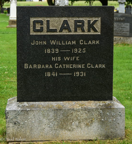 - [S12372] Cemetery marker, Peoples Cemetery, Summerside, Prince County, Prince Edward Island, Canada. John William Clark & Barbara Catherine Clark, tombstone inscription & photograph; read by David A. Walker, 7 July 2017.