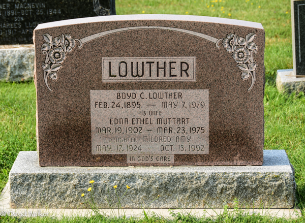 Inscription: LOWTHER / Boyd C. Lowther / Feb. 24, 1895 - May 7, 1979 / His Wife / Edna Ethel Muttart / Mar. 19, 1902 - Mar. 23, 1975 / Daughter Mildred Amy / May 17, 1924 - Oct. 13, 1992 / In God's Care.1  Tombstone, Boyd C. Lowther (1895-1979), his wife Edna Ethel Muttart (1902-1975), their daughter Mildred Amy (1924-1992). Peoples Cemetery, Crapaud, Queens County, Prince Edward Island, Canada.
