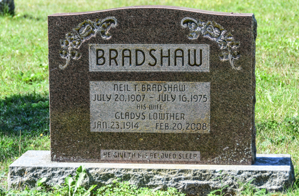 Inscription: BRADSHAW / Neil T. Bradshaw / July 20, 1907 - July 16, 1975 / His Wife / Gladys Lowther / Jan. 23, 1914 - Feb 20, 2008 / He Giveth His Beloved Sleep.5  Tombstone, Neil T. Bradshaw (1907-1975), his wife Gladys W. Lowther (1914-2008). United Church Cemetery, Searletown, Prince County, Prince Edward Island, Canada.