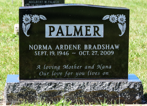 Inscription: PALMER / Norma Ardene Bradshaw / Sept. 19, 1946 - Oct. 27, 2009 / A loving Mother and Nana / Our love for you lives on.3  Tombstone,Norma Ardene Bradshaw (1946-2009). United Church Cemetery, Searletown, Prince County, Prince Edward Island, Canada.