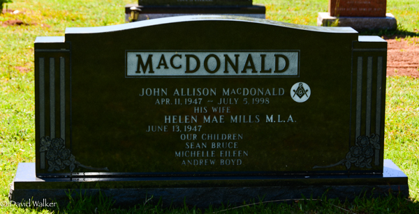 Inscription: MacDONALD / John Allison MacDonald / Apr. 11, 1947 - July 5, 1998 / His Wife / Helen Mae Mills M.L.A. / Jun 13, 1947 - / Our Children / Sean Bruce / Michelle Eileen / Andrew BoydBack:MacDONALD.2  Cemetery marker, John Allison MacDonald (1947-1998), his wife Helen Mae Mills (1947- ). St. John's Anglican Cemetery, St. Eleanors, Prince County, Prince Edward Island, Canada.
