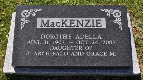 Inscription: MACKENZIE / Dorothy Adella / Aug. 31, 1907 - Oct. 24, 2005 / Daughter of / J. Archibald & Grace M.2  Tombstone, Dorothy Adella MacKenzie (1907-2005). Peoples Cemetery, Kensington, Prince County, Prince Edward Island, Canada.