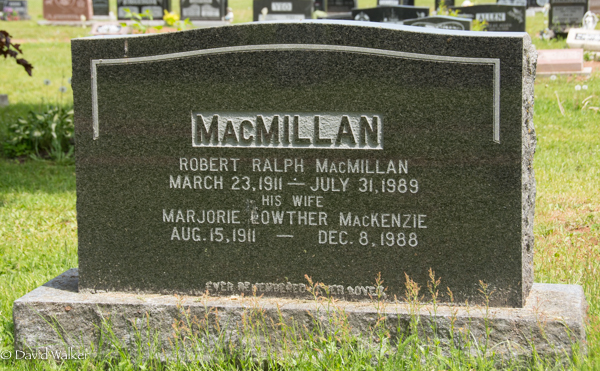 Inscription: MacMILLAN / Robert Ralph MacMillan / March 23, 1911 - July 31, 1989 / His Wife / Marjorie Lowther MacKenzie / Aug. 15, 1911 - Dec. 8, 1988 / Ever remembered, ever loved.1  Tombstone, Robert Ralph MacMillan (1911-1989), his wife Marjorie Lowther MacKenzie (1911-1988). Peoples Cemetery, Summerside, Prince County, Prince Edward Island, Canada.