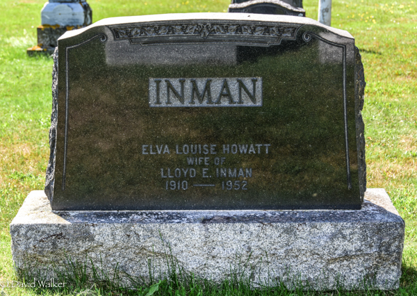 Inscription: INMAN / Elva Louise Howatt / Wife of Lloyd E. Inman / 1910 - 1952.1  Tombstone, Elva Louise Howatt (1910-1952). Church of Scotland Cemetery, Cape Traverse, Prince County, Prince Edward Island, Canada.