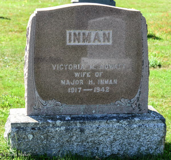Inscription: INMAN / Victoria M. Howatt / Wife of / Major H. Inman / 1917 - 1942.1  Tombstone, Victoria M. Howatt (1917-1942). Church of Scotland Cemetery, Cape Traverse, Prince County, Prince Edward Island, Canada.