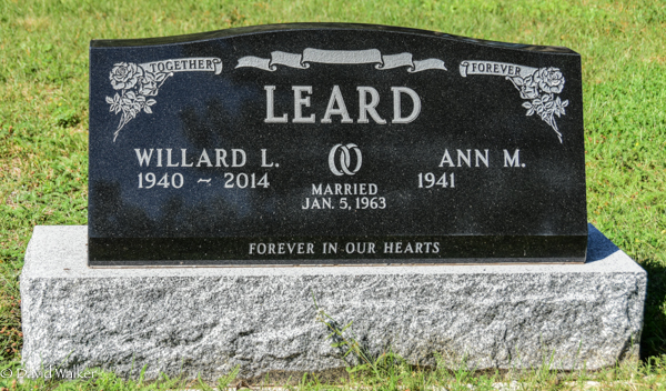 Inscription: LEARD / Willard L. / 1940 - 2014 | Married / Jan. 5, 1963 | Ann M. / 1941 - // Together Forever.1,2  Tombstone, Willard L. Leard (1940-2014), his wife Ann M. Leard (1941- ). United Church Cemetery, Searletown, Prince County, Prince Edward Island, Canada.