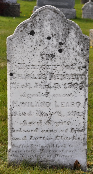 | Burial | He was buried in the People's Cemetery, Mount Stewart, Queens County, Prince Edward Island, 46.36385, -62.85000G. Inscription: In / Memory of / Charles Hebbert / Died Jan. 9, 1902 / Aged 2 mos. / Haviland Leard / Died May 8, 1911 / Aged 6 yrs. / Beloved sons of Ira / and Lottie Clarke / Suffer little children to / come unto Me, for such is / the Kingdom of Heaven.3,1 Tombstone, Charles Hebbert Clark (1901-1902), Haviland Leard Clark (1905-1911), sons of Ira Haviland Clark and Lottie May Leard. The Peoples Cemetery, Mount Stewart, Queens County, Prince Edward Island, Canada. |