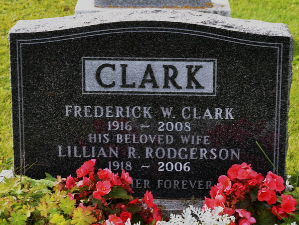 | Burial | He was buried in the Peoples Cemetery, Mount Stewart, Queens County, Prince Edward Island, Canada, 46.36444, -62.85043G. Inscription: CLARK / Frederick W. Clark / 1916 - 2008 / His Beloved Wife / Lillian R. Rogerson / 1918 - 2006 / Together Forever.1,4 Tombstone, Frederick W. Clark (1916-2008), his wife Lillian R. Rogerson (1918-2006). The Peoples Cemetery, Mount Stewart, Queens County, Prince Edward Island, Canada. |