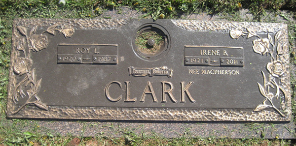 | Burial | He was buried in Floral Hills Memorial Gardens, Pleasant Valley, Queens County, Prince Edward Island, CanadaG.1 Marker, Roy L. Clark (1920-1987), his wife Irene B. MacPherson (1921-2011). Floral Hills Memorial Gardens, Queens County, Prince edwaed Island, Canada. Photo courtesy of MacNaught History Centre & Archives, Summerside, Prince Edward Island. |