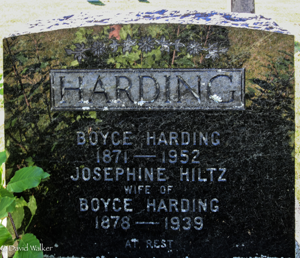 Inscription: HARDING / Boyce Harding / 1871 - 1952 / Josephine Hiltz / Wife of / Boyce Harding / 1878 - 1939 / At Rest.1,2  Cemetery Marker: Boyce Harding (1871-1952), his wife Josephine Hiltz (1878-1939). St. Thomas Anglican Church Cemetery, Springbrook, Queens County, Prince Edward Island, Canada.