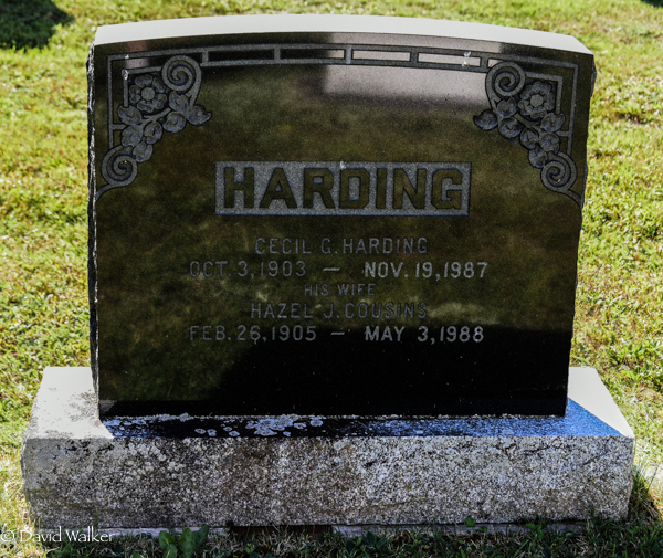 Inscription: HARDING / Cecil G. Harding / Oct. 3, 1903 - Nov. 19, 1987 / His Wife / Hazel J. Cousins / Feb. 26, 1905 - May 3, 1988.1,3  Cemetery Marker: Cecil G. Harding (1903-1987), his wife Hazel J. Cousins (1905-1988). St. Thomas Anglican Church Cemetery, Springbrook, Queens County, Prince Edward Island, Canada.