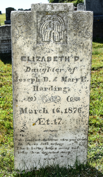 Inscription: Elizabeth D. / Daughter of / Joseph D. & Mary E. / Harding / Died / March 16, 1876, / Æt. 17.1,2  Cemetery Marker: Elizabeth D. Harding (1859-1876). St. Thomas Anglican Church Cemetery, Springbrook, Queens County, Prince Edward Island, Canada.