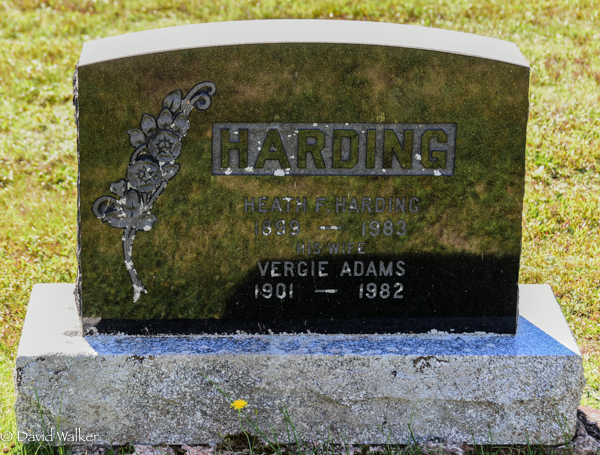 | Principal 2 | She witnessed the burial of Heath F. Harding and Vergie Adams in St. Thomas Anglican Church Cemetery, Springbrook, Queens County, Prince Edward Island, Canada, 46.49860, -63.50589G.1,2 Cemetery Marker: Heath F. Harding (1899-1983), his wife Vergie Adams (1901-1982). St. Thomas Anglican Church Cemetery, Springbrook, Queens County, Prince Edward Island, Canada. |