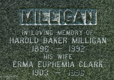Inscription: MILLIGAN / In Loving Memory of / Ida Grace Baker / Wife of / Colin G. Milligan / 1866 - 1931 / Colin G. Milligan / 1867 - 1954Back: MILLIGAN / In Loving Memory of / Harold Baker Milligan / 1896 - 1992 / His Wife / Erma Euphemia Clark / 1903 - 1996.2  Tombstone, Colin G. Milligan (1867-1954), his wife Ida Grace Baker (1866-1931), their son Harold Baker Milligan (1896-1992), his wife Erma Euphemia Clark (1903-1996). Peoples Cemetery, Summerside, Prince County, Prince Edward Island, Canada.  Back inscription detail.
