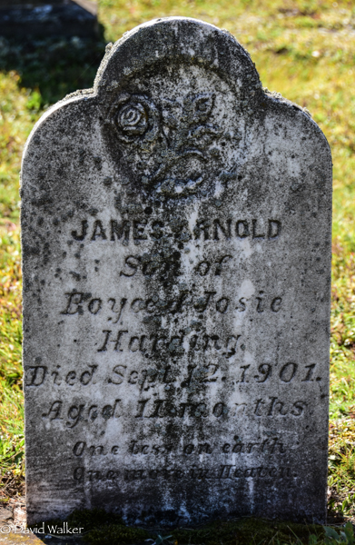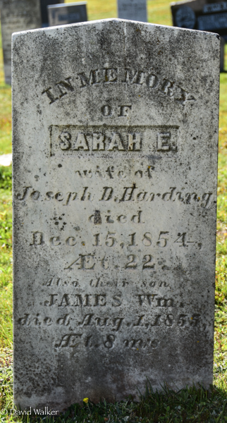 Inscription: In Memory / of / Sarah E. / Wife of / Joseph D. Harding / died / Dec. 15, 1854, / Æt. 22. / Also their son / James Wm. / died Aug. 1, 1855, / Æt. 8 m's.2,3  Cemetery Marker: Sarah E. Harding (1832-1854), her son James William (1854-1855). St. Thomas Anglican Church Cemetery, Springbrook, Queens County, Prince Edward Island, Canada.