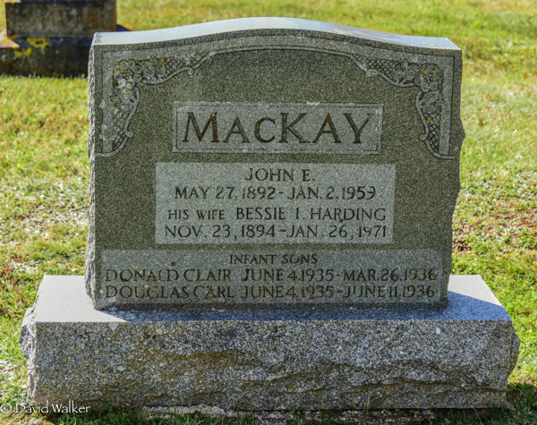 Inscription: MACKAY / John E. / May 27, 1892 - Jan. 2, 1959 / His Wife Bessie I. Harding / Nov. 23, 1894 - Jan. 26, 1971 / Infant Sons / Donald Clair June 4, 1935 - Mar. 26, 1936 / Douglas Carl June 4, 1935 - June 11, 1936.1,2  Cemetery Marker: John Everett MacKay (1892-1959), his wife Bessie Iola Harding (1894-1971), their twin sons Donald Clar (1935-1936) and Douglas Carl 1935-1936). St. Thomas Anglican Church Cemetery, Springbrook, Queens County, Prince Edward Island, Canada.