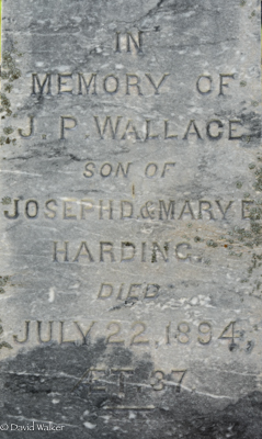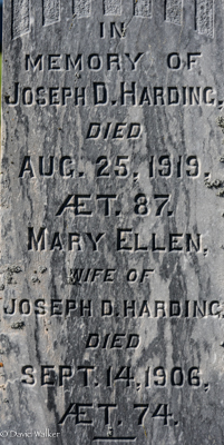 Inscription: In / Memory of / Joseph D. Harding, / Died / Aug. 25, 1919, / ÆT. 87. / Mary Ellen, / Wife of / Joseph D. Harding / Died / Sept. 14, 1906, / ÆT. 74.Right: In / Memory of / J. P. Wallace / Son of / Joseph D. & Mary E. / Harding / Died / July 22, 1894, / ÆT. 37.2,3  Cemetery Marker: Joseph Davidson Harding (1832-1919), his wife Mary Ellen Sims (1832-1906), their son J. P. Wallace Harding (1857-1894). St. Thomas Anglican Church Cemetery, Springbrook, Queens County, Prince Edward Island, Canada.  Front inscription detail.  Right inscription detail.