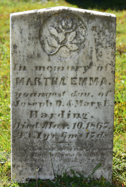 Inscription: In memory of / Martha Emma / youngest dau. of / Joseph D. & Mary E. / Harding, / Died Mar. 10, 1867, / Æt. 1 y'r, 6 m's, 17 d's.3  Cemetery Marker: Martha Emma Harding (1865-1867). St. Thomas Anglican Church Cemetery, Springbrook, Queens County, Prince Edward Island, Canada.