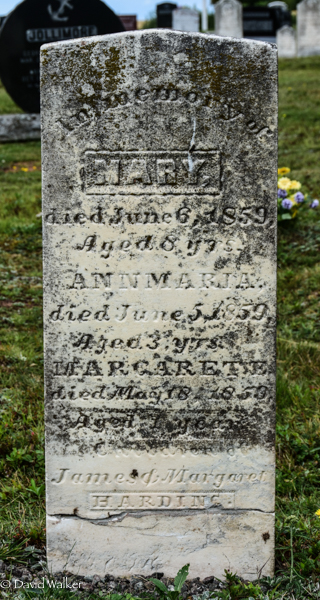 Inscription: In memory of / Mary / died June 6, 1859, / Aged 8 yr's / Anna Maria / died June 5, 1859, / Aged 3 yr's / Margaret / died May 18, 1859, / Aged 1 year / Daughters of / James & Margaret / Harding.1,3  Cemetery Marker: Mary Harding (1851-1859), her sisters Ann Maria (1856-1859) and Margaret (1858-1859). St. Thomas Anglican Church Cemetery, Springbrook, Queens County, Prince Edward Island, Canada.