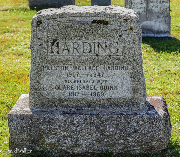 Inscription: Harding / Preston Wallace Harding / 1907 - 1947 / His Beloved Wife / Clare Isabel Quinn / 1917 - 1969.1,2  Cemetery Marker: Preston Wallace Harding (1907-1947), his wife Clare Isabel Quinn (1917-1969). St. Thomas Anglican Church Cemetery, Springbrook, Queens County, Prince Edward Island, Canada.