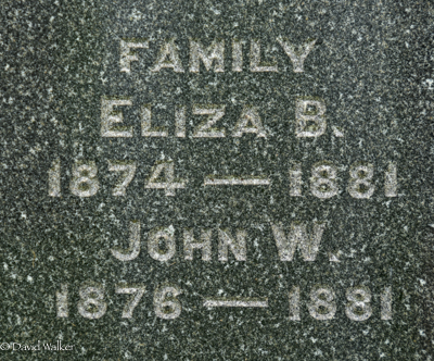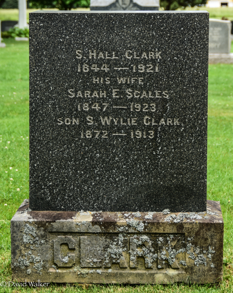Inscription: S. Hall Clark / 1844 - 1921 / His Wife / Sarah E. Scales / 1847 - 1923 / Son S. Wylie Clark / 1872 - 1913 / CLARKBack: Eliza B. / 1874 - 1881 / John W. / 1876 - 1881Flatstones, John, Eliza, Wylie, Mother.1  Tombstone, S. Hall Clark (1844-1921), his wife Sarah E. Scales (1847-1923), their children Wylie (1872-1913), Eliza (1874-1881) and John (1876-1881). Peoples Cemetery, Summerside, Prince County, Prince Edward Island, Canada.  Back inscription detail.  Footstone, Eliza Clark.  Footstone, John Clark.  Footstone, Wylie Clark.  Footstone, Sarah (Scales) Clark.