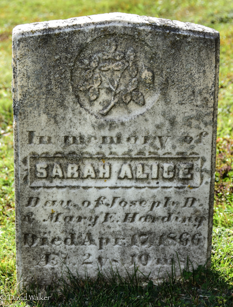 Inscription: In memory of / Sarah Alice / Dau. of Joseph D. / & Mary E. Harding / Died Apr. 17, 1866 / Æt. 2 ys, 10 ms.2  Cemetery Marker: Sarah Alice Harding (1863-1866). St. Thomas Anglican Church Cemetery, Springbrook, Queens County, Prince Edward Island, Canada.