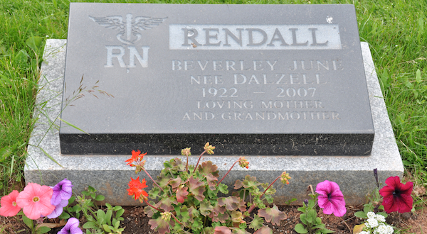 Inscription: RENDALL / Beverly June /Nee Dalzell / 1922 - 2007 / Loving Mother / and Grandmother.1  Tombstone, Beverly June (Dalzell) Rendall. The Peoples Cemetery, Kensington, Prince County, Prince Edward Island.