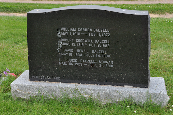 Inscription: DALZELL / In Loving memory of / Edson White Dalzell / Nov. 3, 1888 - Aug. 3, 1971 / His Wife / Annie Florence Larkin / May 19, 1896 - April 22, 1960 / To live in hearts we leave behind is not to die.Footstones: FATHER MOTHERBack: William Gordon Dalzell / May 1, 1918 - Feb. 11, 1972 / Robert Goodwill Dalzell / June 15, 1919 - Oct. 6, 1989 / David Denzil Dalzell / May 18, 1934 - July 24, 1996 / E. Louise (Dalzell) Morgan / Mar. 10, 1929 - Dec. 21, 2001 / Perpetual Care.6  Tombstone, Edson White Dalzell, his wife Annie Florence Larkin, their sons William Gordon, Robert Goodwill & David Denzil, and daughter Louise. The Peoples Cemetery, Kensington, Prince County, Prince Edward Island.  Back inscription detail.
