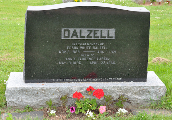 Inscription: DALZELL / In Loving memory of / Edson White Dalzell / Nov. 3, 1888 - Aug. 3, 1971 / His Wife / Annie Florence Larkin / May 19, 1896 - April 22, 1960 / To live in hearts we leave behind is not to die.Footstones: FATHER MOTHERBack: William Gordon Dalzell / May 1, 1918 - Feb. 11, 1972 / Robert Goodwill Dalzell / June 15, 1919 - Oct. 6, 1989 / David Denzil Dalzell / May 18, 1934 - July 24, 1996 / E. Louise (Dalzell) Morgan / Mar. 10, 1929 - Dec. 21, 2001 / Perpetual Care.4  Tombstone, Edson White Dalzell, his wife Annie Florence Larkin, their sons William Gordon, Robert Goodwill & David Denzil, and daughter Louise. The Peoples Cemetery, Kensington, Prince County, Prince Edward Island.  Back inscription detail.