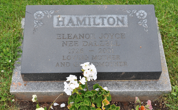 Inscription: HAMILTON / Eleanor Joyce / Nee Dalzell / 1926 - 2001 / Loving mother / and grandmother.1  Tombstone, Eleanor Joyce (Dalzell) Hamilton. The Peoples Cemetery, Kensington, Prince County, Prince Edward Island.