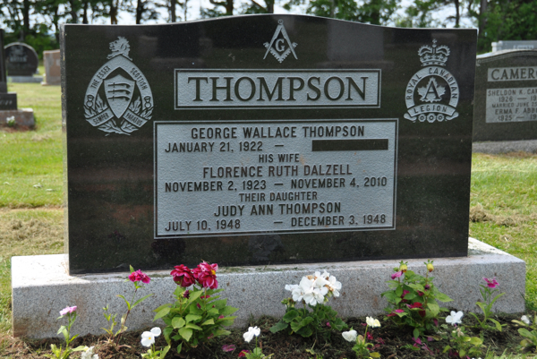 Inscription: THOMPSON / George Wallace Thompson / January 21, 1922 - 2012 / His Wife / Florence Ruth Dalzell / November 2, 1923 - November 4, 2010 / Their daughter / Judy Ann Thompson / July 10, 1948 - December 3, 1948.4,1  Tombstone, George Wallace Thompson (1922 -2012), his wife Florence Ruth Dalzell (1923 - 2010), their daughter Judy Ann Thompson (1948 - 1948). Peoples Cemetery, Kensington, Prince County, Prince Edward Island.