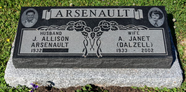 Inscription: ARSENAULT / Husband / J. Allison / Arsenault / 1932 - | Wife / A. Janet / (Dalzell) / 1933 - 2002.4,3  Tombstone, Allison Arsenault (1932- ), his wife Janet Dalzell (1933-2002). Peoples Cemetery, Kensington, Prince County, Prince Edward Island, Canada.