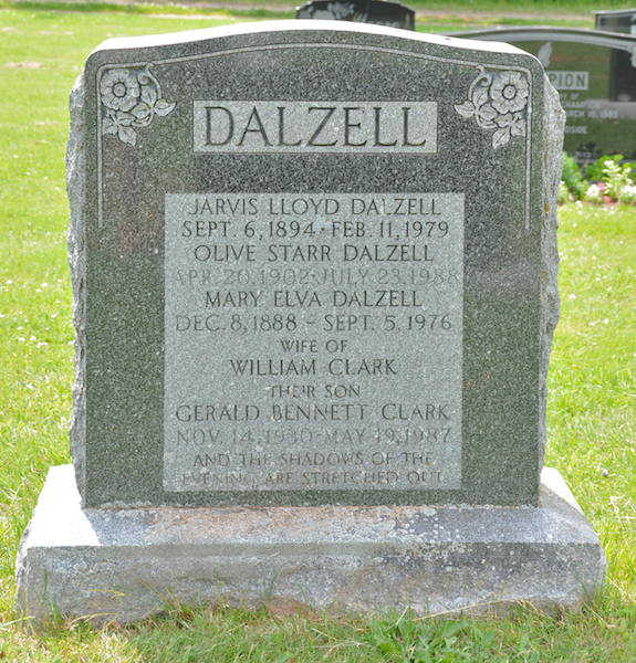 Inscription: Dalzell / Jarvis Lloyd Dalzell / Sept. 6, 1894 - Feb. 11. 1979 / Olive Starr Dalzell / Apr. 20, 1902 - July 23, 1988 / Mary Elva Dalzell / Dec. 8, 1888 - Sept. 5, 1976 / Wife Of / William Clark / Their Son / Gerald Bennet Clark / Nov. 14, 1930 - May 19, 1987 / And The Shadows Of The / Evening Are Stretched Out.6  Tombstone, Jarvis Lloyd Dalzell, his sister Olive Starr Dalzell, his sister Mary Elva Dalzell, and Mary's son Gerald Bennett Clark. The Peoples Cemetery, Kensington, Prince County, Prince Edward island.