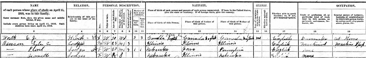 | Census | She was head of the household in the census on 16 April 1910 in Lincoln Ward, Lancaster County, Nebraska, USAG. Elizabeth (age 30) was a widow at this census. A young couple and their infant daughter were lodgers. Elizabeth was a dressmaker, working at home.8 1910 US Census, Lincoln Ward, Lancaster County, Nebraska. Household of widowed Elizabeth Jane (Walker) Worth, recorded here simply as E J Worth. A young couple and their infant daughter were lodgers. |