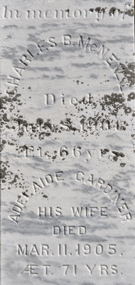 | Burial | She was buried in the Peoples Cemetery, Summerside, Prince County, Prince Edward Island, Canada, 46.40542, -63.77713G. Inscription: In Memory of / Charles B. McNeill / Died / July 8, 1901 / Æt. 66 yrs. / Adelaide Gardiner / His Wife / Died / Mar. 11, 1905, / ÆT. 71 yrs.Right: Eva J. McNeill / Died / Sept. 4, 1948 / Aged 85 yrs.Back. Mary S. Gardiner / Died / April 24, 1920 / Aged 82 years.1,4 Tombstone, Charles B. McNeill (1834-1901), his wife Adelaide Gardiner (1834-1905), their daughter Eva (1866-1948), Mary S. Gardiner (1838-1920), sister of Adelaide Gardiner. Peoples Cemetery, Summerside, Prince County, Prince Edward Island, Canada.  Right inscription detail.  Back inscription detail.  Front inscription detail. |