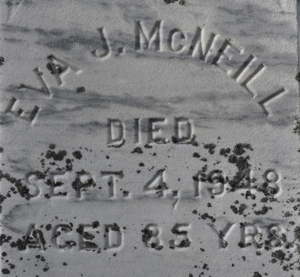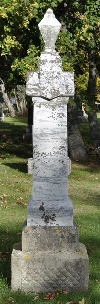 | Burial | He was buried in the Peoples Cemetery, Summerside, Prince County, Prince Edward Island, Canada, 46.40542, -63.77713G. Inscription: In Memory of / Charles B. McNeill / Died / July 8, 1901 / Æt. 66 yrs. / Adelaide Gardiner / His Wife / Died / Mar. 11, 1905, / ÆT. 71 yrs.Right: Eva J. McNeill / Died / Sept. 4, 1948 / Aged 85 yrs.Back. Mary S. Gardiner / Died / April 24, 1920 / Aged 82 years.4,5 Tombstone, Charles B. McNeill (1834-1901), his wife Adelaide Gardiner (1834-1905), their daughter Eva (1866-1948), Mary S. Gardiner (1838-1920), sister of Adelaide Gardiner. Peoples Cemetery, Summerside, Prince County, Prince Edward Island, Canada.  Right inscription detail.  Back inscription detail.  Front inscription detail. |