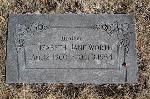 | Burial | She was buried on 6 October 1954 in Lincoln Memorial Park, Lincoln, Lancaster County, Nebraska, USAG.2,14 Marker, Elizabeth Jane (Walker) Worth (1860-1954). Lincoln Memorial Park, Lincoln, Nebraska. Photo courtesy of findagrave.com. |
