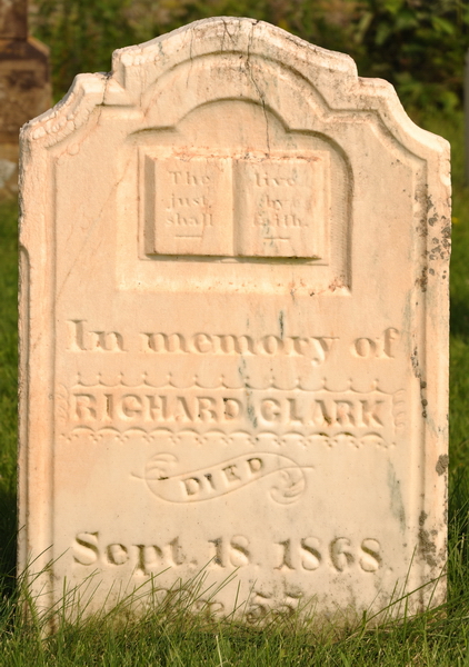 | Burial | He was buried in North Bedeque Cemetery, North Bedeque, Prince County, Prince Edward Island, Canada, 46.36168, -63.72619G. Inscription: The just shall / live by faith / In memory of / Richard Clark / Died / Sept. 18, 1868. / AEt. 55.8 Tombstone for Richard Clark (1813-1868)North Bedeque Cemetery, Prince County, Prince Edward Island, Canada. |