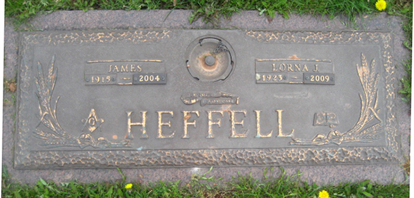 Garden of the Last Supper, Row 11. Inscription: James / 1915 - 2004 | Lorna J. / 1923 - 2009 // Heffell.2  Cemetery marker, James Heffell (1915-2004), his wife, Lorna J. Warren (1923-2009). Floral Hills Memorial Gardens, Pleasant Valley, Queens County, Prince Edward Island, Canada. Photo courtesy of peiancestry.com