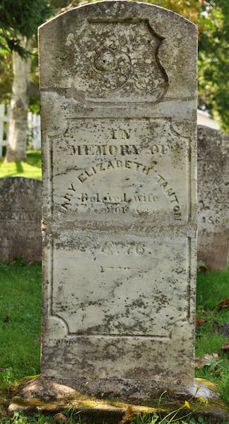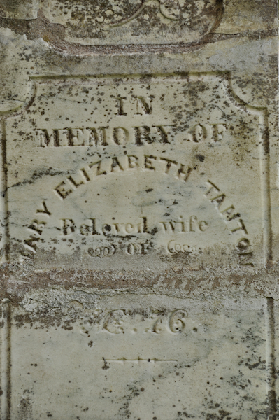 | Burial | She was buried in St. John's Anglican Church Cemetery, St. Eleanors, Prince County, Prince Edward Island, 46.41954, -63.81023G. damaged & partially restored marker. Inscription: In / Memory of / Mary Elizabeth Tanton / Beloved Wife of / [broken section] AE 76.2 Tombstone, Mary Elizabeth Tanton (1798-1874). St. John's Anglican Church Cemetery, St. Eleanors, Prince County, Prince Edward Island, Canada.  Front inscription detail. |