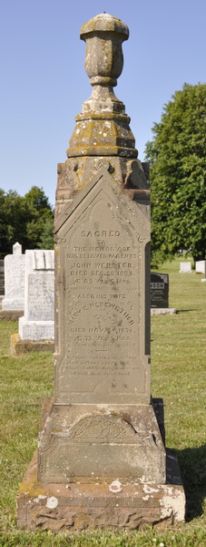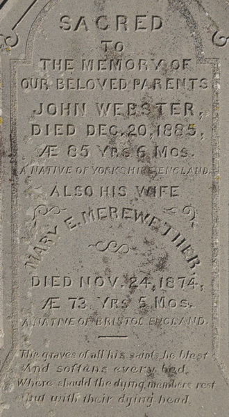 | Burial | He was buried in the United Church Cemetery, Margate, Prince County, Prince Edward Island, Canada, 46.45899, -63.58946G. Inscription: Sacred / to / The Memory of / Our Beloved Parents / John Webster / Died Dec. 20, 1885, / Æ 85 yr's 6 mos. / A Native of Yorkshire, England / Also His Wife / Mary E. Merewether / Died Nov. 24, 1874, / Æ. 73 yrs. 5 mos. / A Native of Bristol, England / The graves of all his saints be blest / And softens every bed / Where should the dying members rest / But with their dying head.1 Tombstone, John Webster (1800-1885), his wife Mary Merewether (1802-1875). (Southwest River) United Church Cemetery, Margate, Prince County, Prince Edward Island, Canada.  Inscription detail. |