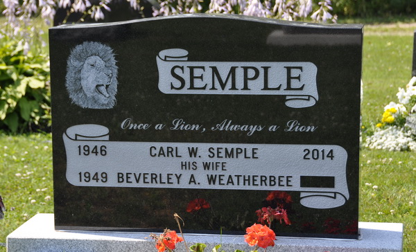Inscription: SEMPLE / Once a Lion, Always a Lion / 1946 Carl W. Semple 2014 / 1949 Beverly A. Weatherbee Back: SEMPLE.1,2  Tombstone, Carl W. Semple (1946-2014), his wife Beverly A. Weatherbee (1949- ). Peoples Cemetery, Kensington, Prince County, Prince Edward Island, Canada.