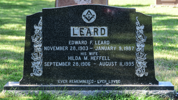 Inscription: LEARD / Edward F. Leard / November 28, 1903 - January 9, 1987 / His Wife / Hilda M. Heffell / September 28, 1906 - August 11, 1995 / Ever Remembered - Ever Loved.2,3  Tombstone, Edward F. Leard (1903-1987), his wife Hilda M. Heffell (1906-1995). United Church Cemetery, Searletown, Prince County, Prince Edward Island, Canada.