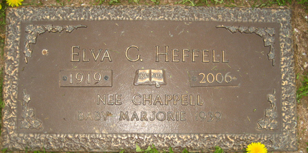 Inscription: Elva G. Heffell / 1919 - 2006 / Nee Chappell / Baby Marjorie 1939.2  Cemetery marker, Elva G. (Chappell) Heffell (1919-2006), her daughter Marjorie (1939-1939). Floral Hills Memorial Gardens, Pleasant Valley, Queens County, Prince Edward Island, Canada. Photo courtesy of peiancestry.com